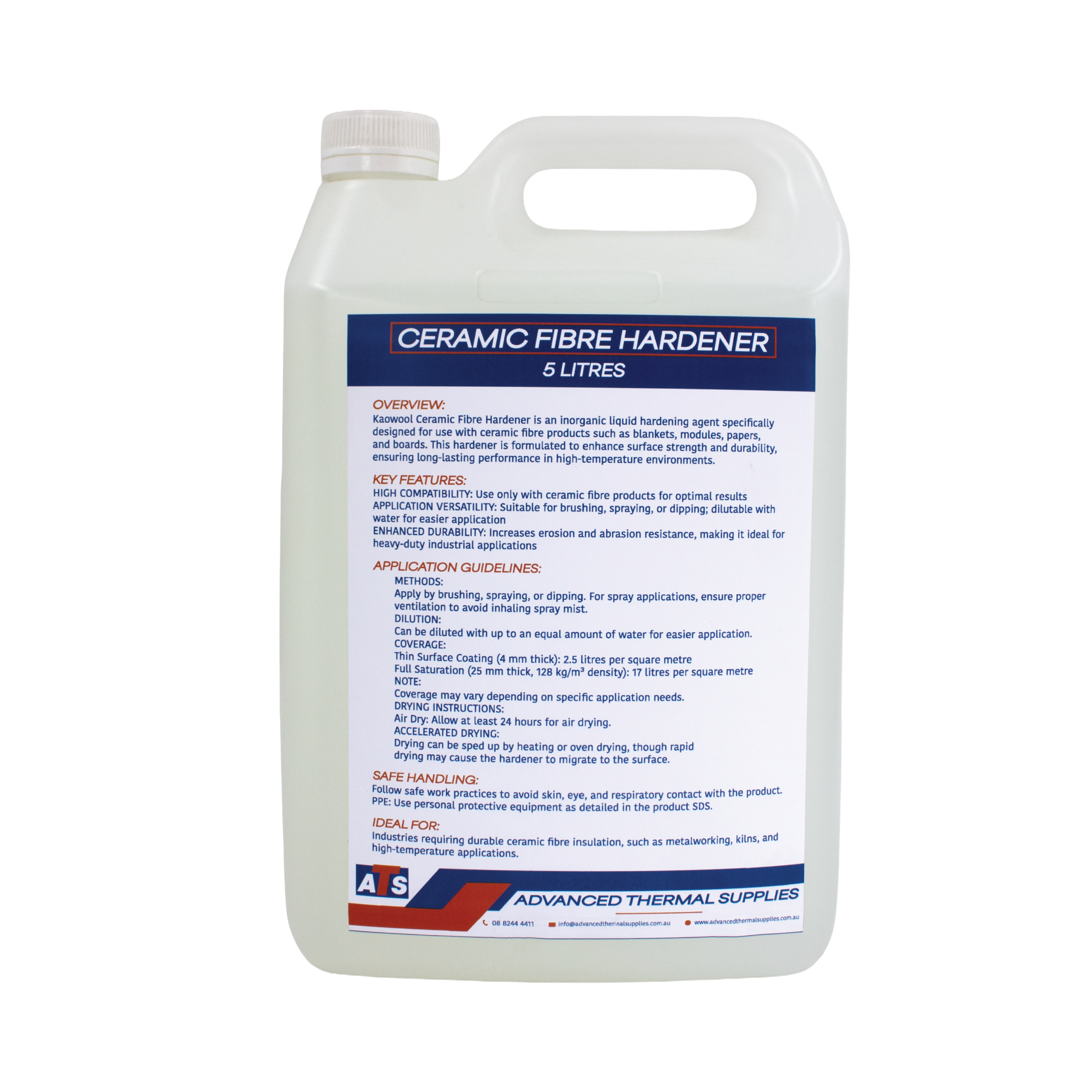Ceramic Fibre Hardener — also commonly referred to as a Ceramic Refractory Rigidiser — is a high-performance inorganic liquid agent designed to improve the surface strength and durability of ceramic fibre products (often known as Kaowool) such as blankets, modules, papers, and boards. Supplied in 1 L and 5 L containers, its specialised formulation increases resistance to erosion and abrasion, ensuring long-lasting performance in demanding high-temperature environments.